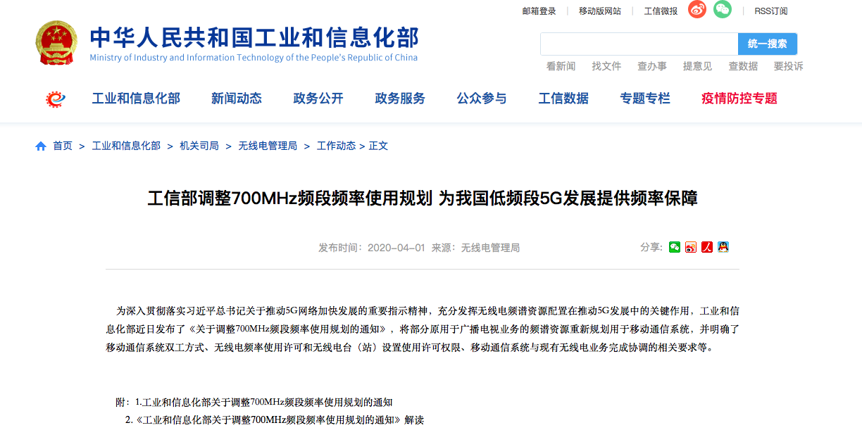4月1日消息 工业和信息化部近日发布了《关于调整700MHz频段频率使用规划的通知》(以下简称<通知>),将部分原用于广播电视业务的频谱资源重新规划用于移动通信系统,并明确了移动通信系统双工方式、无线电频率使用许可和无线电台(站)设置使用许可权限、移动通信系统与现有无线电业务完成协调的相关要求等。