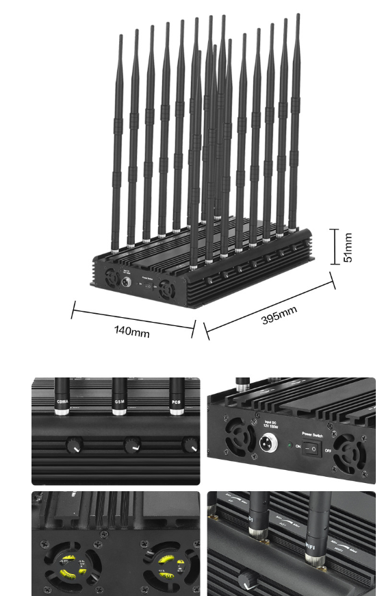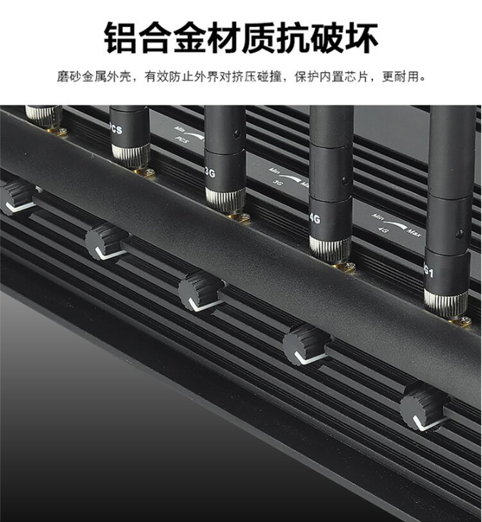 本机采用16路输出,能在1-15米半径(视基站信号强弱而定)范围对中国移动,联通,电信的2G,3G,4G,,2.4GWIFI,5.8GWIFI,蓝牙,热点信号,VHF,UHF等无线信号进行屏蔽。