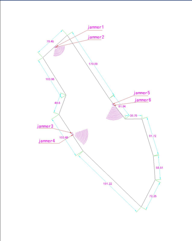 2、干扰主机6台(干扰系统3套),每套6个定向天线,12个频段,每个塔/杆放置3个天线和1个主机,所以需要6个塔/杆,位置如图所示。